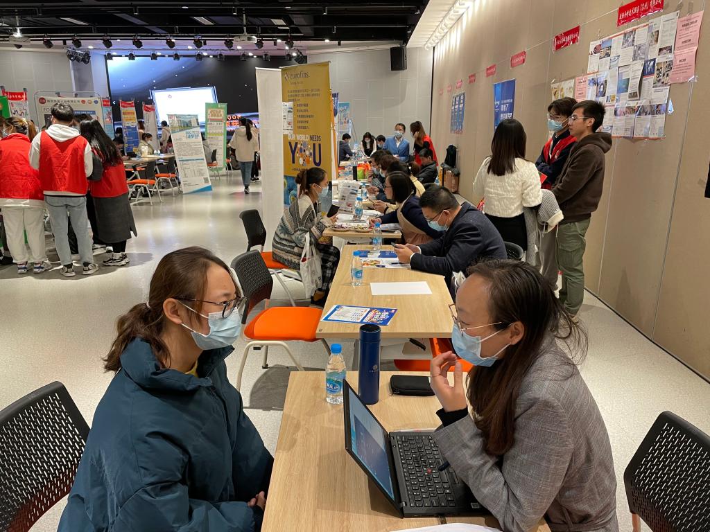 招聘会现场,应届毕业生辅导员李琳、胡晓丹与公司招聘人员进行了交流,深入了解企业的招聘需求。