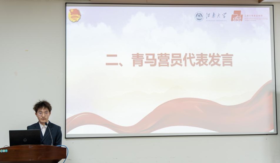 营员代表、食质2302班邢陈佳发言。他分享自己对青年马克思主义者培养工程的认知和理解,并代表全体营员庄严承诺,将以饱满的热情、积极的态度投入到培训全过程之中,认真完成每一项培训任务,相互学习交流,共同成长进步。