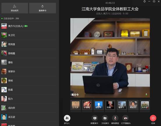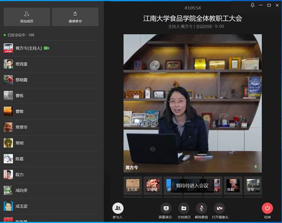 2020年4月21日上午,食品学院召开2020年春夏学期全体教职工大会。按照新冠肺炎疫情防控工作要求,会议在学院D925会议室和线上会议室同步进行。学院党政班子成员以及教职工200余人参加了会议。会议由食品学院党委书记傅莉莉主持。