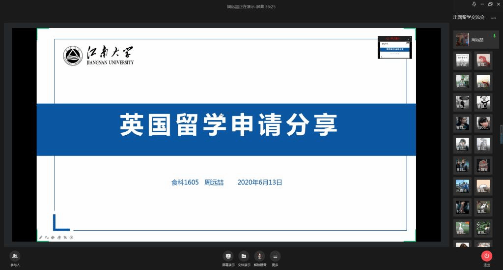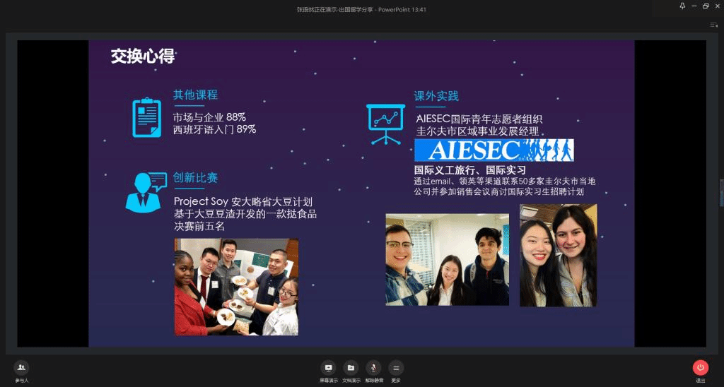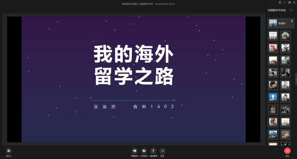 为帮助2021届毕业年级同学做好准备,熟悉出国留学申请流程,6月13日晚,食品学院举办线上出国留学经验分享会,邀请张语然、杨佃琪、周远喆、米嘉琦四位优秀毕业生与同学们分享自己的留学申请经验,260余名低年级同学参加分享会。