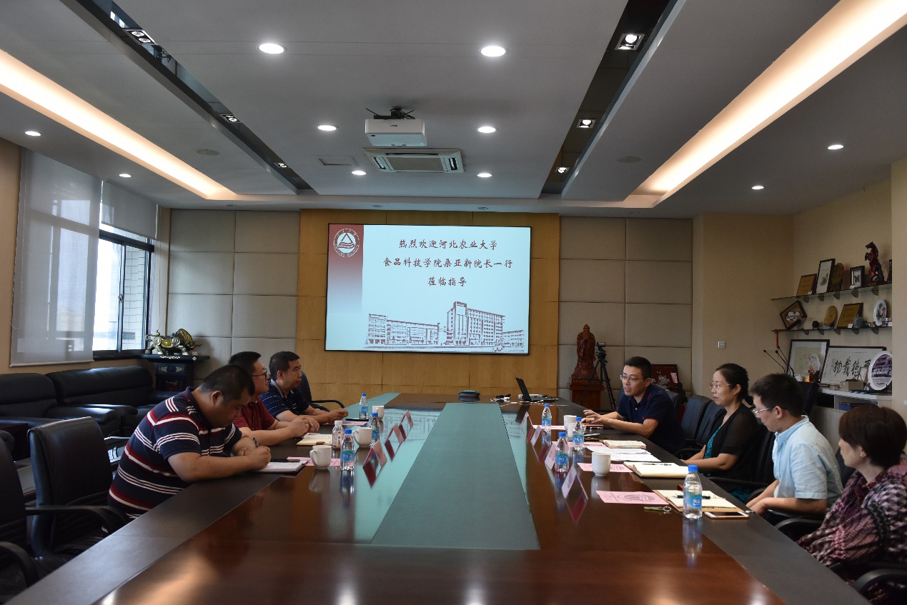 2020年9月8号,河北农业大学食品科技学院院长桑亚新、教学副院长张志胜、院党委副书记、副院长赵金辉一行来访我院,食品学院党委书记傅莉莉、食品学院副院长王立、食品学院党委副书记、副院长魏珍吉、教学中心卢蓉蓉教授等人参加了会谈。