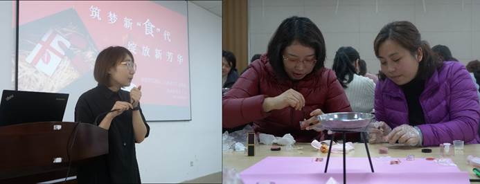 食品学院分工会特地邀请口红制作工作室的老师前来教学。活动伊始,老师首先进行了知识分享,鼓励大家要用最好的妆容细心装扮自己;分享结束后,老师按照材料混合-倒入模具-安装完成-制作包装的步骤进行教学,随后参加活动的老师们开始按照步骤制作属于自己的口红。