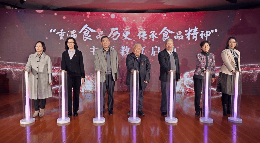 食品学院历任党委书记于民基、魏晓明、郭贯新、王海鸥、张影陆、向琪、傅莉莉上台,共同启动食品学院“重温食品历史,传承食品精神”主题教育活动。