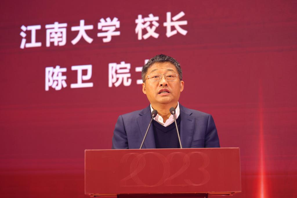 陈卫致辞。他代表江南大学向莅临的各位来宾表示热烈的欢迎,向长期关心支持江南大学发展的领导和专家表示诚挚的感谢。他指出,习近平总书记强调,加快实现高水平科技自立自强,是推动高质量发展的必由之路,这为江苏食品工业发展指明方向。自江苏食品科学与技术学会成立以来,已取得了丰硕的成绩,成为推进江苏省食品产业科技创新发展的重要力量。未来,江南大学将继续支持江苏省食品科学与技术学会的各项工作,为江苏食品科技发展搭建平合,贡献力量。