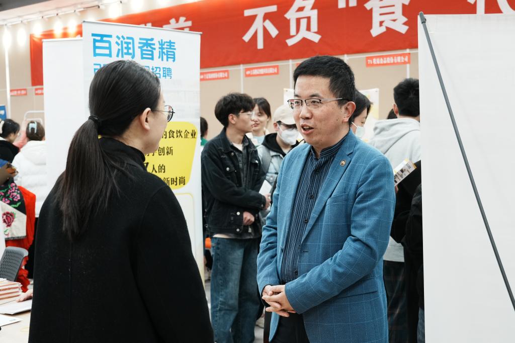 食品学院党委副书记、副院长李雷,分团委副书记李琳以及本科毕业年级辅导员杨光宝、硕士毕业年级辅导员陈婷、博士毕业年级辅导员胡卉君等来到会场,与企业充分交流,了解行业招聘形势和用人单位需求。李雷鼓励同学们树立积极的求职观念,精准分析自身情况,努力与企业实现“双向奔赴”。