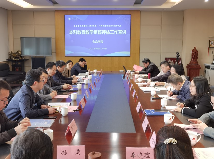 为深入开展学习贯彻习近平新时代中国特色社会主义思想主题教育,进一步以教学评估为契机夯实本科教育教学工作,4月24日上午,食品学院本科教育教学审核评估工作宣讲会暨主题教育调研会在D910会议室召开。江南大学党委常委、副校长堵国成,纪委副书记、党委巡察工作办公室主任丁文勤,教务处(教师发展中心)处长李兆丰,以及审核评估督察组、工作专班成员一行,食品学院党政领导、教学督导代表、教师代表、本科教务工作人员等参加此次会议。会议由本科教学副院长谢云飞主持。