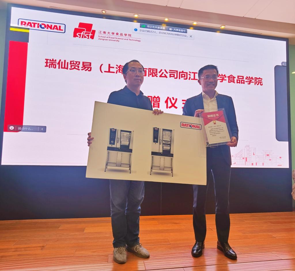 活动现场还举行了Rational设备捐赠仪式。俞文军代表瑞仙公司向食品学院捐赠2台最先进的烹饪设备供本届大赛及相关研发活动使用。程力代表食品学院向俞文军颁发捐赠证书。