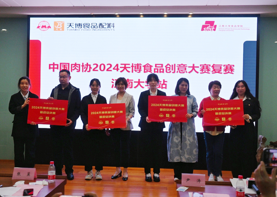 近日,中国肉类协会2024天博食品创意大赛江南大学站复赛在食品学院D912报告厅隆重举行。本次大赛评委由浙江天圣食品有限公司研发部长尹涛、苏州润喆食品有限公司总经理朱小帆、杭州麦尚食品有限公司总经理俞叶飞、苏州极味邦食品有限公司研发总监蔡愈杭、维汉森生物工程科技无锡有限公司总经理韦国强、江南大学国家大学科技园副总经理张翼、食品学院副研究员纪杭燕担任。山东天博食品配料有限公司市场部经理王云龙,大赛负责人程林,区域经理李永雷、李江宁,食品学院竞赛秘书叶舒迪作为嘉宾出席活动。