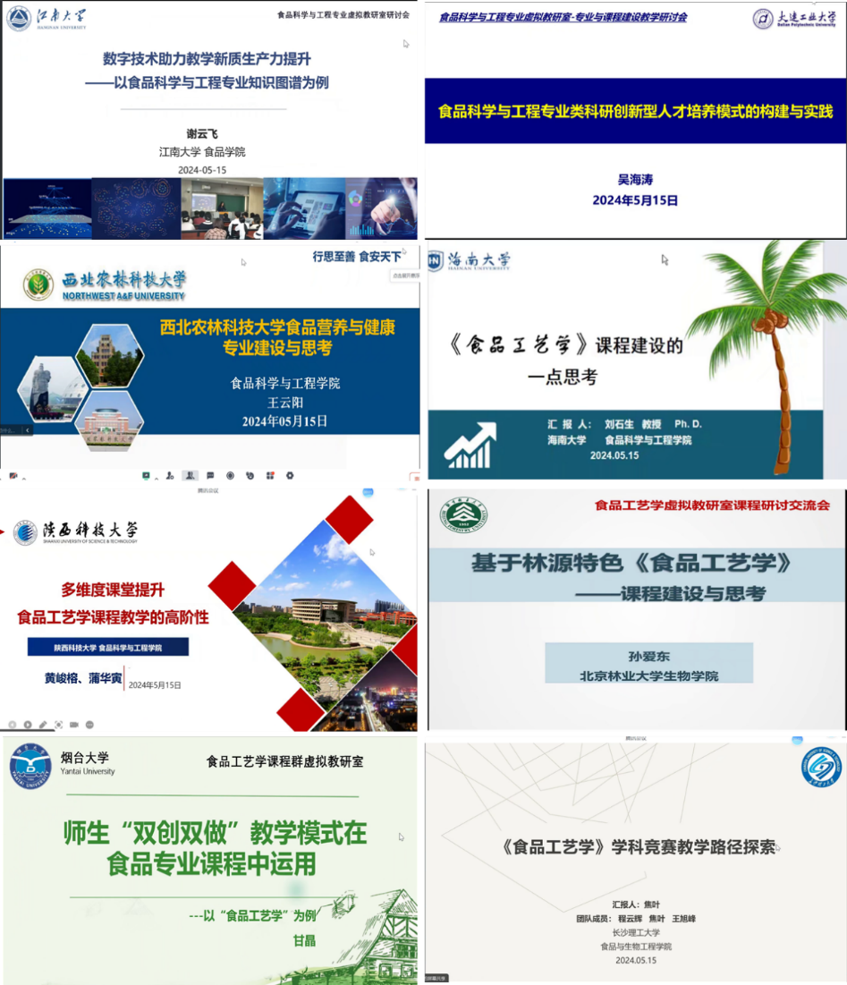 本次研讨会分为专业建设和课程群建设两个主题。在专业建设主题研讨中,江南大学谢云飞副院长、西北农林科技大学王云阳副院长和大连工业大学吴海涛副院长分别做了题为“数字技术助力教学新质生产力提升-以食品科学与工程专业知识图谱为例”、“西北农林科技大学食品营养与健康专业建设与思考”和“食品科学与工程类专业科研创新型人才培养模式的构建与实践”的分享报告。随后,北京林业大学孙爱东教授、陕西科技大学蒲华寅教授、海南大学刘石生教授、石河子大学程少波副教授、东北林业大学李德海副教授、烟台大学甘晶副教授、长沙理工大学焦叶副教授围绕食品工艺学课程建设分别做了题为“基于林源特色《食品工艺学》课程建设与思考”、“多维度课堂提升食品工艺学课程教学的高阶性”、“《食品工艺学》课程建设的一点思考”、“专业认证背景下“食品工艺学”课程的建设与探索“、“《植物产品加工工艺学》实验课程改革与探索”、“师生“双创双做”教学模式在食品专业课程中的应用-以食品工艺学为例”、“《食品工艺学》学科竞赛教学路径探索”7场主题报告。此次研讨会持续三个多小时,引起了与会专家和老师的热烈反响,他们表示,通过本次研讨会,开阔了眼界、拓展了思路,学习到很多宝贵的专业建设和课程建设的经验和方法,对于提升食品专业的教学质量将起到极大的帮助作用。