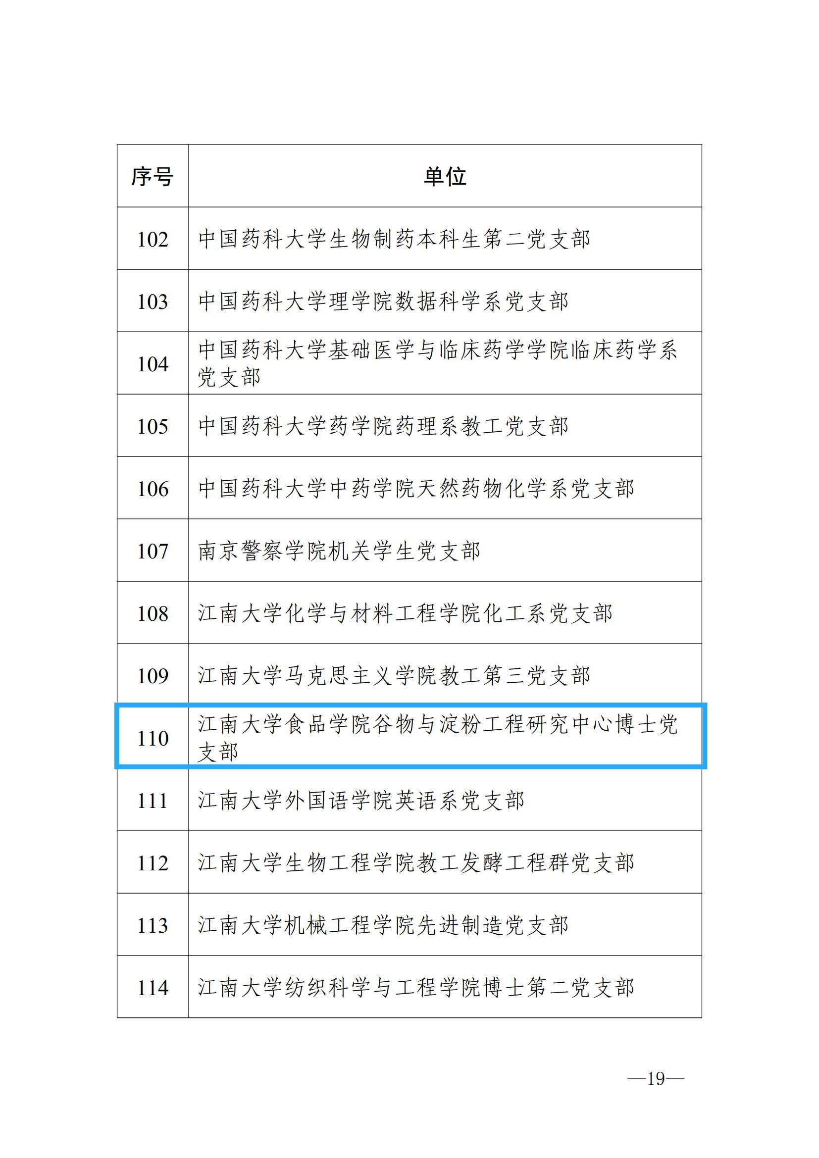 近日,江苏省委教育工委发布《省委教育工委关于公布第二批全省党建工作示范高校、标杆院系、样板支部培育建设单位名单的通知》(苏委教组函〔2024〕19号)。我院谷物与淀粉工程研究中心博士党支部成功入选第二批“全省党建工作样板支部”培育建设单位。