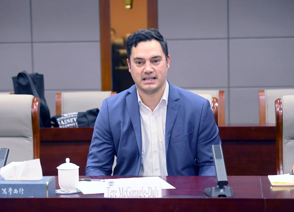 会前,Tere McGonagle-Daly一行前往第二教学楼,与食品学院国际班学子亲切会面。他向大家介绍梅西大学的办学条件与生活环境,鼓励同学们努力学习、充分准备,盼望尽快在新西兰聚首。