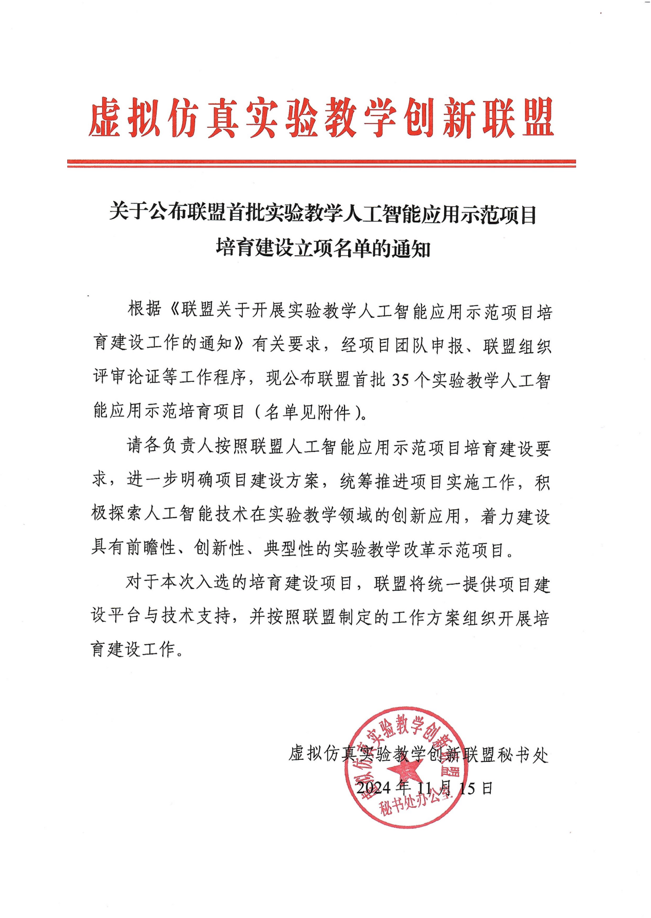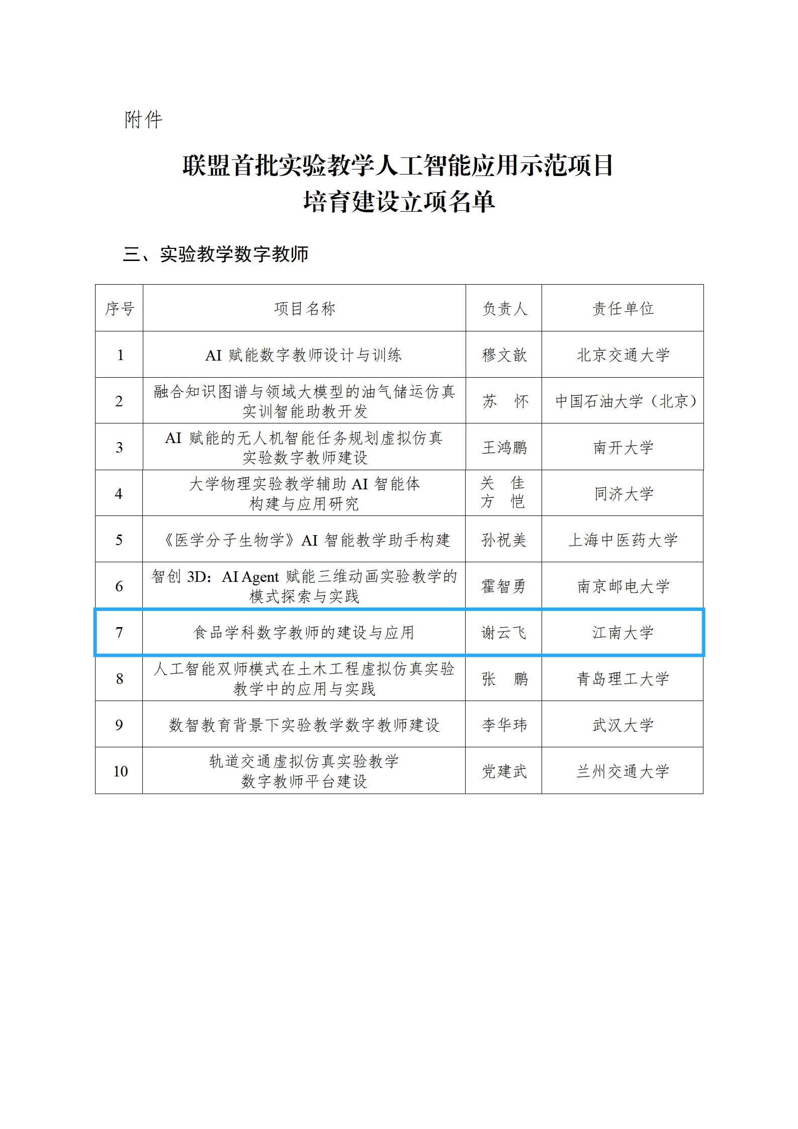 近日,虚拟仿真实验教学创新联盟正式公布首批实验教学人工智能应用示范项目培育建设立项名单。经过严格的评审与筛选,全国共有35所高校项目脱颖而出。Kaiyun官方网站登录入口谢云飞教授负责的“食品学科数字教师的建设与应用”获批立项,这标志着我院在实验教学领域的人工智能应用探索上迈出了重要一步,为提升实验教学的质量和水平注入了新的活力。