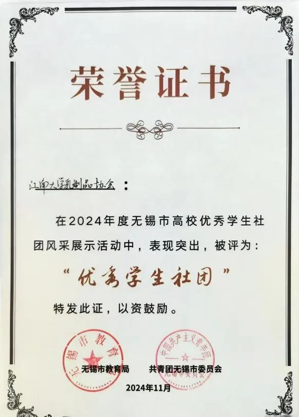 近日,由无锡市教育局、共青团无锡市委员会共同举办的“社彩纷呈·团聚锡城”2024年无锡市高校十佳学生社团评选活动在太湖学院举行。经现场答辩和风采展示,江南大学乳制品协会最终荣膺无锡市大学生“优秀学生社团”。作为获奖社团代表,乳制品协会还受邀参与第二届无锡市大学生科技系列活动启动仪式。