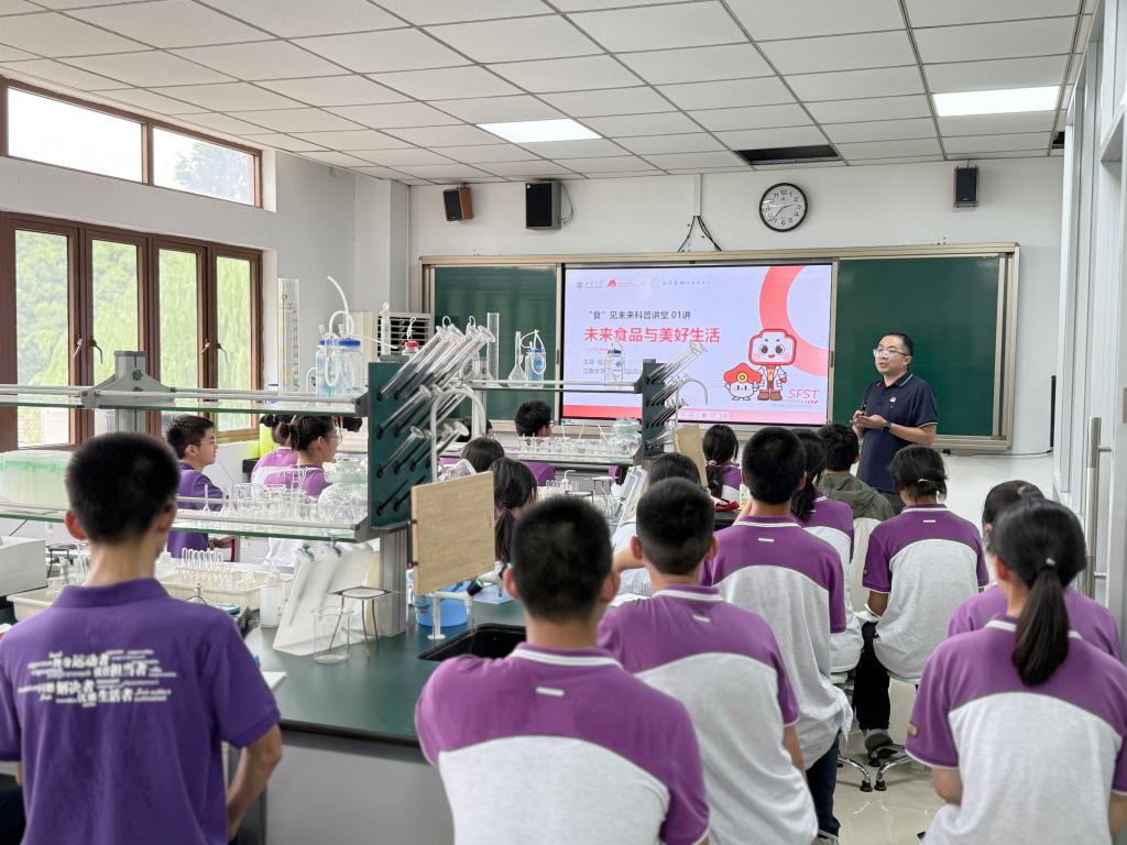 为普及前沿食品学科知识,培育一批热爱科学、崇尚创新的食品新青年,在学校的指导与支持下,食品学院与江苏省锡山高级中学充分利用双方资源与平台优势,联合打造为期一年的食品科普课程——“食”见未来科普课堂。全国首个科普月期间,“食”见未来科普课堂第一讲《未来食品与美好生活》在省锡中正式开讲。