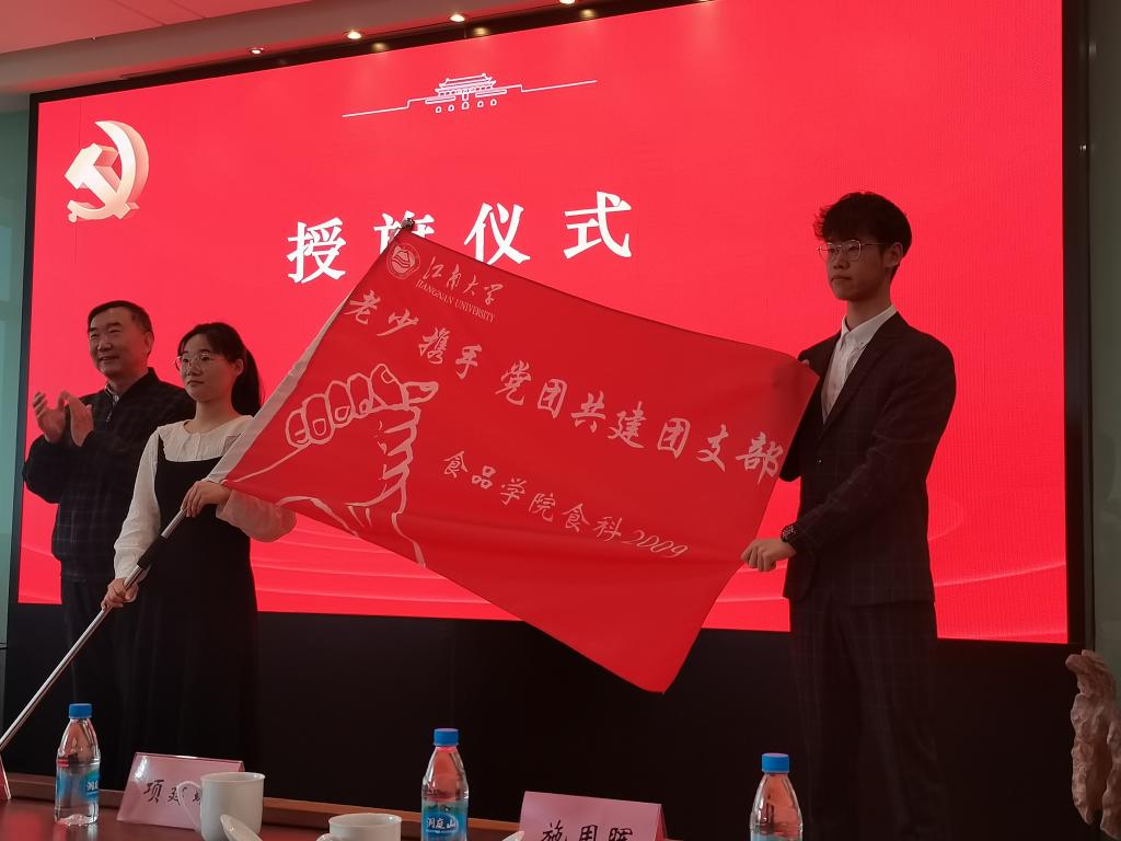活动现场举行了“老少携手 党团共建”团支部授旗仪式,郭贯新老师为食科2009团支部授旗。